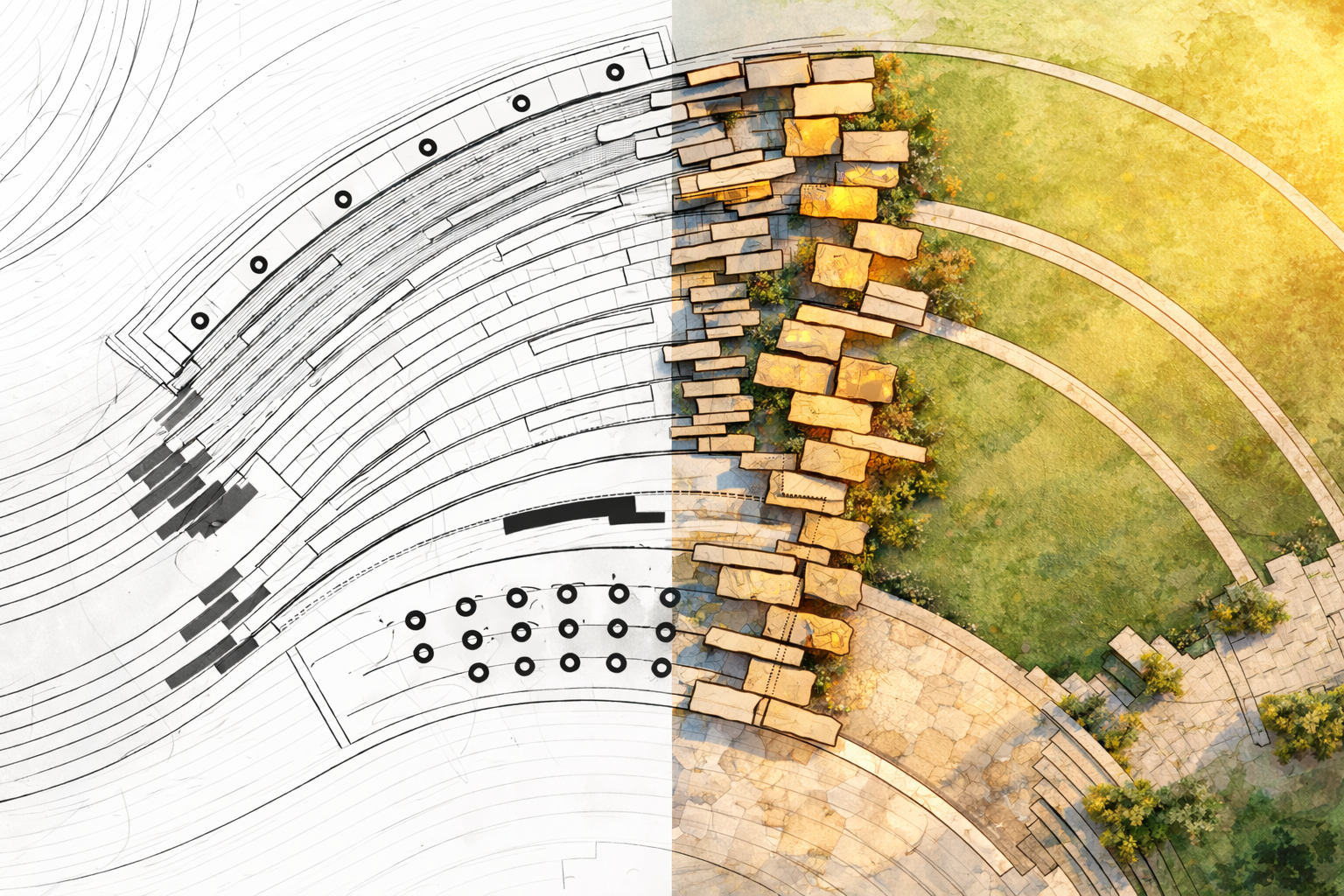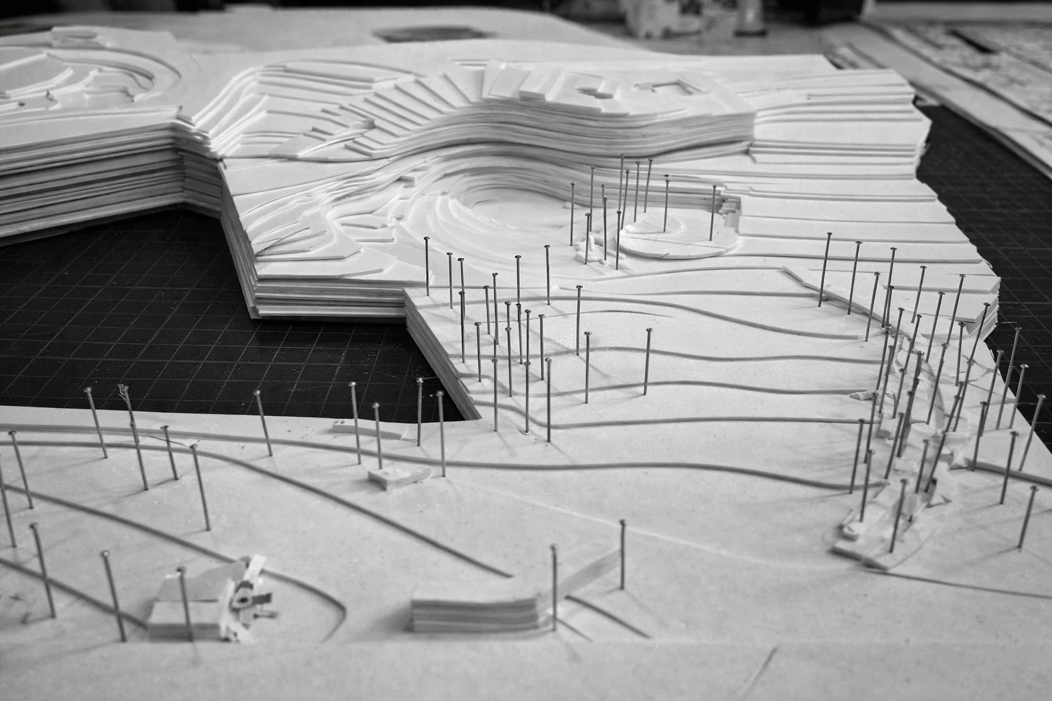Site visits were crucial to understanding the scale of the landscape and its relationship to the museum architecture. Hand-drawn design sketches helped refine key ideas during the design process.