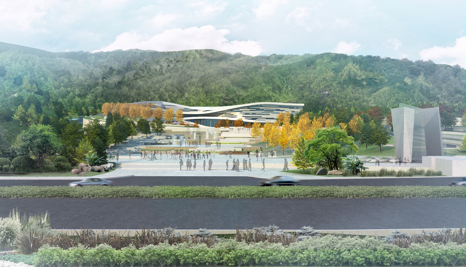 The design focused on creating an open front view and a series of layered terraces arranged within a systematic, modern landscape framework.