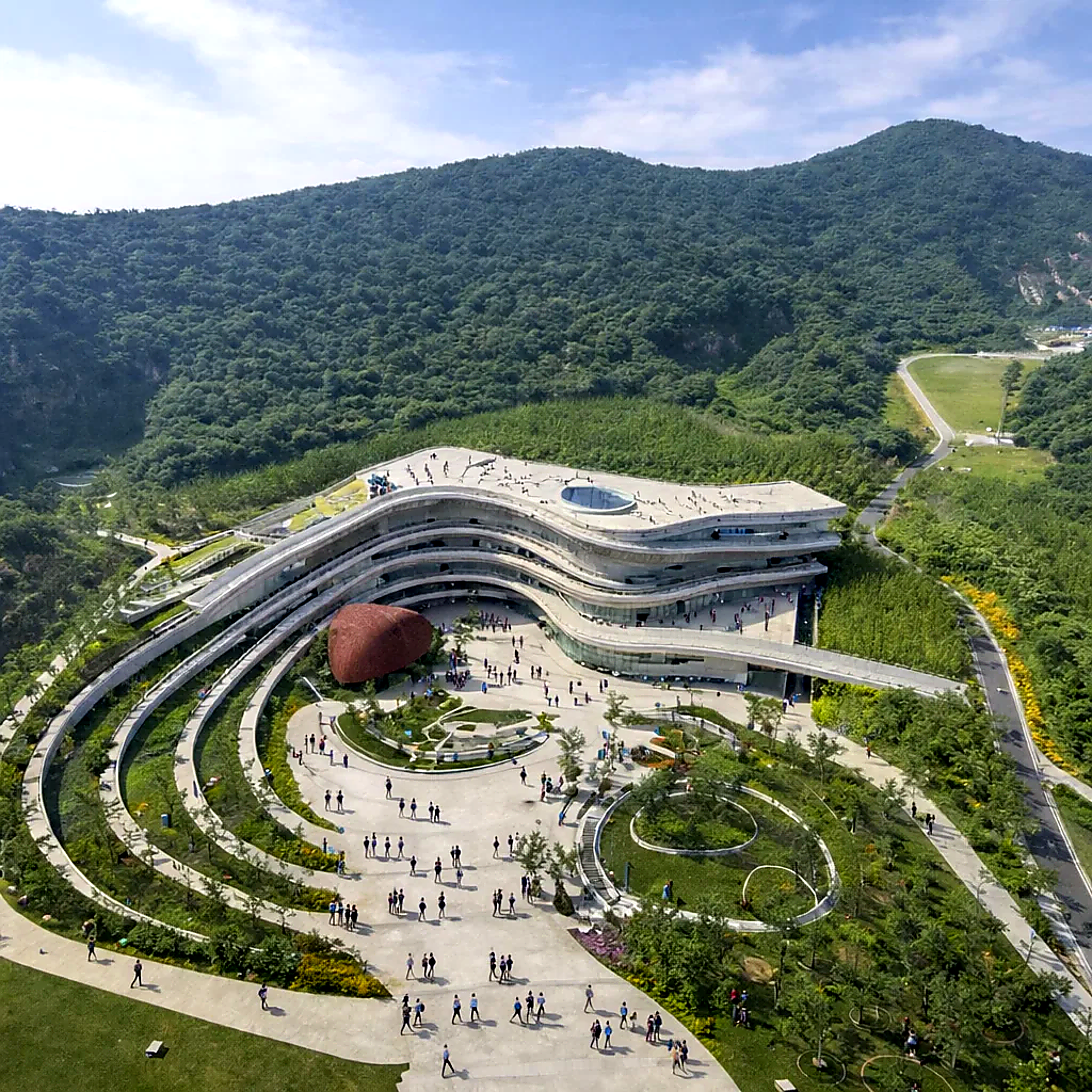 A modern design enhances the museum's landscape architecture.
