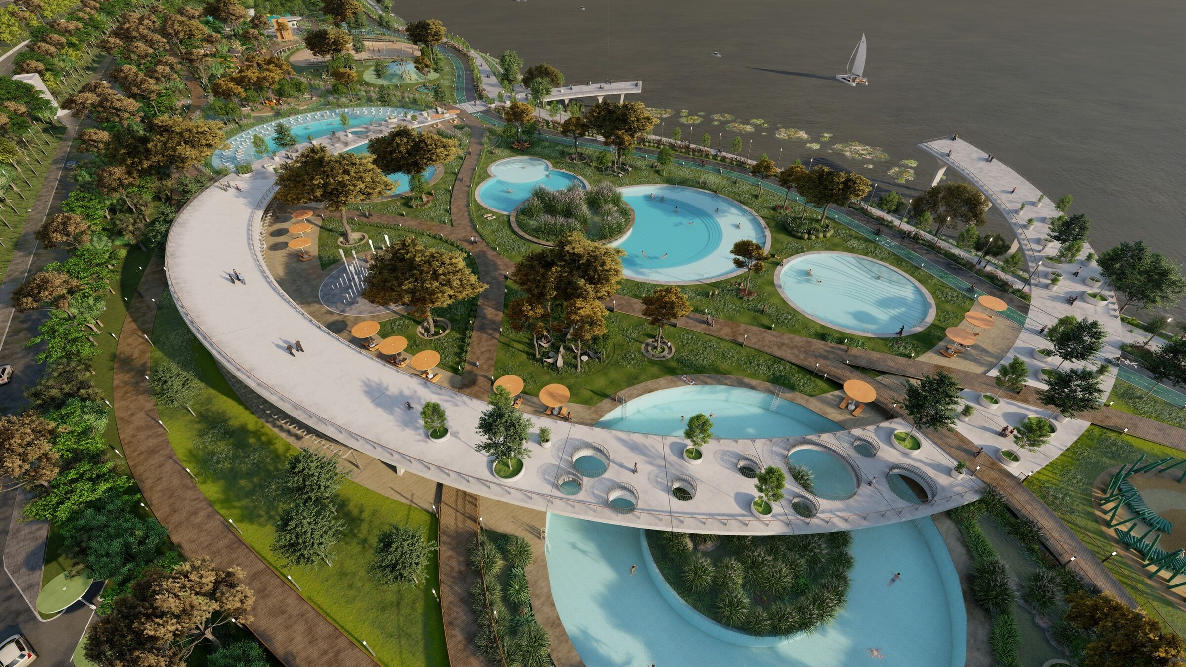 A layered waterfront landscape where flowing pathways, circular pools, and planted islands create a continuous sequence of movement and pause. The Han River Ring—derived from the Yin and Yang of the Korean flag—is transformed into an elevated deck overlooking the river for four-season use, juxtaposed with a natural swimming pool system that blends recreation, ecology, and sculptural design into a unified public experience.